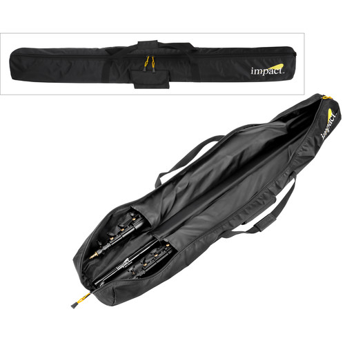 The 12.9′Β Pro Backdrop Support KitΒ fromΒ ImpactΒ is a sturdy, secure way of hanging cloth backgrounds or seamless paper rolls weighing up to 38 lb. The kit comes with two stands and a telescoping crossbar. The stands have a maximum height of 13.5′ – enough to give you headroom for low-angle shooting. Their minimum height is 4.5′. The crossbar telescopes from 4.8 to 12.9′ – more than enough to handle rolls of 9′ seamless paper and canvas backdrops. Reversible spigots with 1/4″ and 3/8″ mounting posts are included, allowing you to use the stands with other gear when not using the crossbar. It all fits in a provided deluxe padded case.