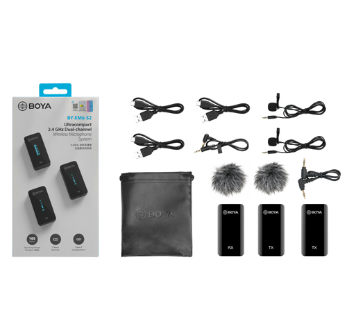 TheΒ BOYA BY-XM6-S2, a 2.4GHz dual-channel wireless microphone system, consists of two transmitters and one receiver. Itβs a perfect sound capturing and delivering solution for two-person vlog, YouTube video, live streaming, interview, recording, etc.