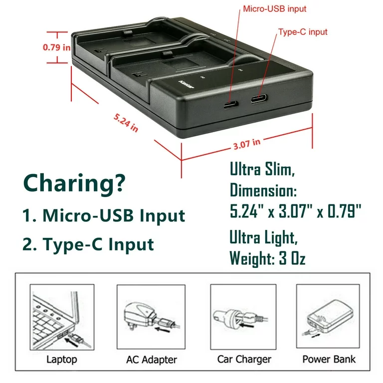 • Easy to carry, the Charger Input: 5V 2-3A 15W; Output: 8.4V/4.2V 800mA(x1) 800mA(x2).