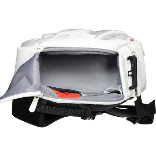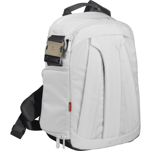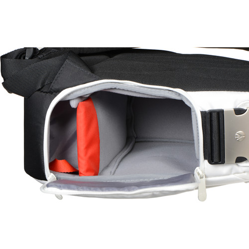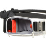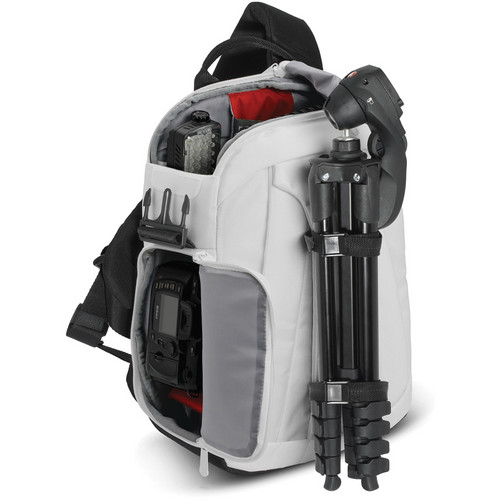 The whiteΒ Stile Collection: Agile V SlingΒ fromΒ ManfrottoΒ is slightly larger than the Agile 1 version. The Agile V is also a functional compromise between aΒ backpack and shoulder bag. For the shooter who likes versatility, this may be the perfect bag for you. With its padded, comfortable strap, you normallyΒ wear it on your back. However, when you’re ready to shoot, just swing it forward to the front, unzip the lower compartment, grab your camera that is held with attached lens in shooting position, take your shot, re-zip the bag, swing it behind you and move on. Unlike a traditional backpack, you won’t have to stop, take the pack off, retrieve your gear and shoot. The Agile V provides the happy medium with which to both tote and shoot in one fell swoop – in one swift motion.