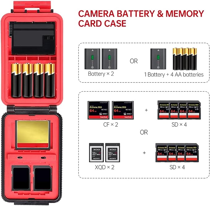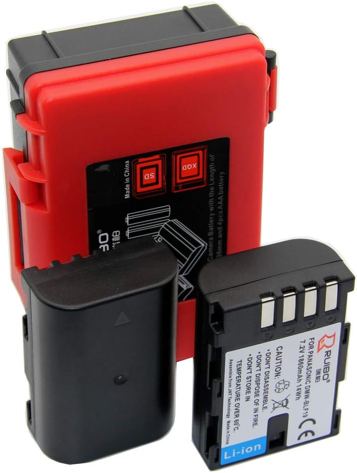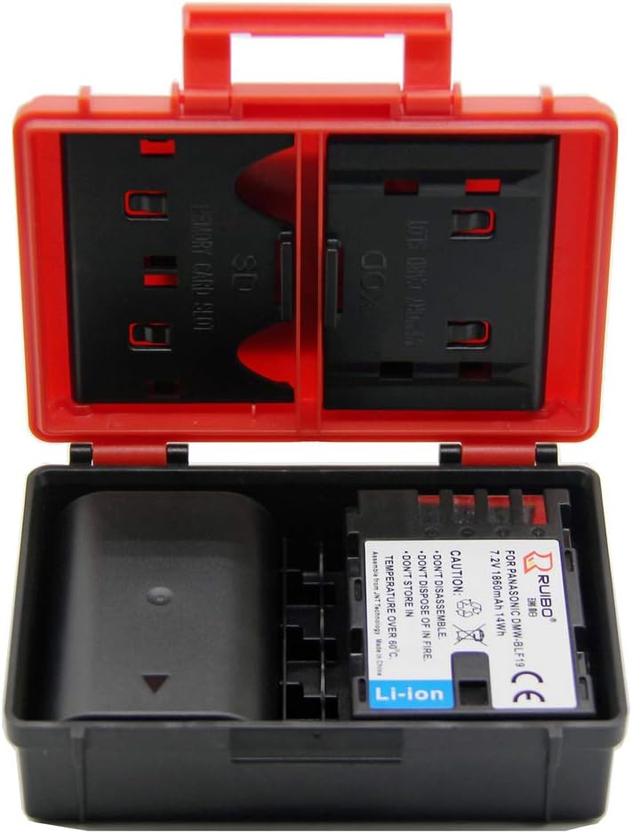 Model: RC-DMW-BLF19 Kit inlcuded: Plastic Case + 2 x DMW-BLF19 Li-ion batteries Capacity: Holds 2 Li-ion Batteries + 2 SD cards + 1 CF card Or Holds 1 Li-ion Battery + 4 AA Batteries + 2 SD cards +1 CF card Material: ABS+PC Color: Black & Red Size : 98*74*34mm Weight: 80g / PCS Packing : Blister + Color CardMulti-function Case: This small size battery case can be used as memory card case.it is a multi-function case Light Weight: Made of ABS Plastic,let this light weight battery card holder durable and easily carrying Lager Compatibility: you can put all the battery or similar size products into it Dust-proof: It can prevent dust into the case Can holds the Li-ion Batetry Models: For Sony NP-FZ100 / NP-FW50 For Panasonic DMW-BLC12 / DMW-BLF19 For Fujiflim FNP-W126 For Canon LP-E6N / LP-E8 For Nikon EN-EL15 / EN-EL15B, EN-EL14/ EN-EL14a For Olympus PS-BLS5 / PS-BLN1